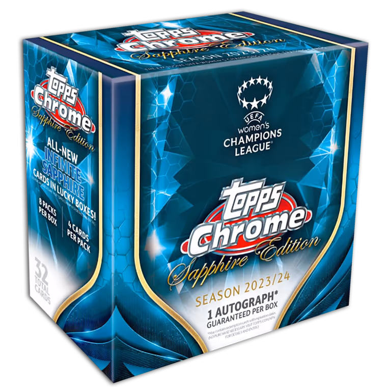 Each UEFA Women’s Champions League Sapphire Box contains 32 cards, distributed across 8 packs with 4 cards per pack. Each box always includes one Autograph Card.