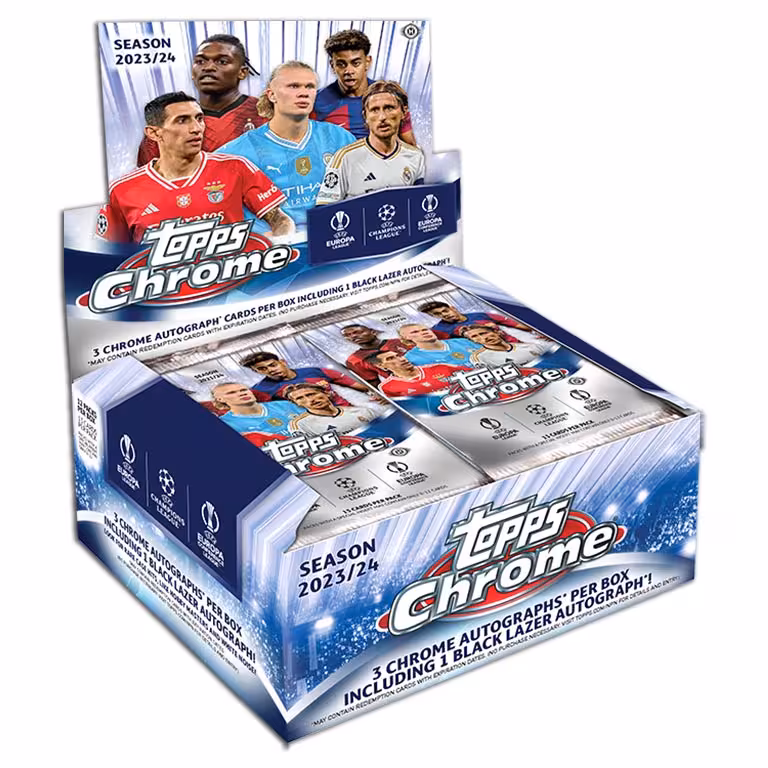 Mit einem neuen Produkt Line-up überrascht Topps die Sammler der Chrome Cards zur den europäischen Klubwettbewerben. Neben den 2023-24 TOPPS Chrome UEFA Club Competitions Soccer Cards Hobby Boxen und Blastern, warten diesmal auch Jumbo Boxen auf die Sammler.