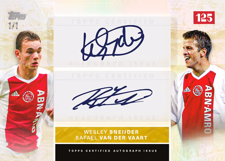 Topps celebrates the 125th anniversary of one of Europe’s most storied clubs – AFC Ajax – with a premium trading card set. The 2024-25 TOPPS AFC Ajax 125th Anniversary Soccer Cards collection offers fans of the “Godenzonen” 4 Encased Autograph Cards and 1 numbered Parallel Card in a high-quality collector’s box.