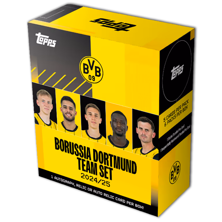 The BVB Team Set 2024/25 boxes are offered via the Topps online shop or through retailers specializing in Sports Cards.