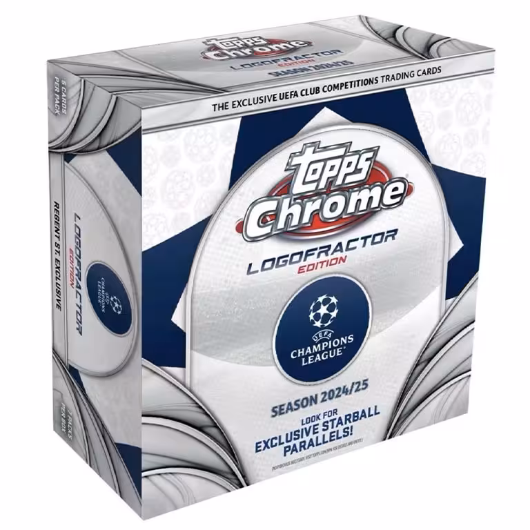 Mit den 2024-25 Topps Chrome Logofractor Edition UEFA Club Competitions Soccer Cards erscheint erstmals im Soccer Bereich eine spezielle Logofractor Box mit exklusiven Inserts und Parallels. In durchschnittlich jeder zweiten Box des aus Baseball und Formel 1 bekannte Formats können Sammler zudem eine Autograph Card von den Stars der Kollektion oder einer Legende des europäischen Fußballs finden.