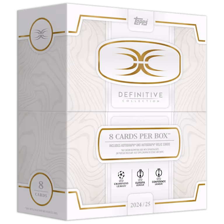Each hobby box of the 2024-25 Topps Definitive UEFA Club Competitions Soccer Cards collection contains eight cards, with each card being either an autograph card, an autograph relic card, or a pure relic card. At least one Marks of Excellence Autograph Card is guaranteed per box.