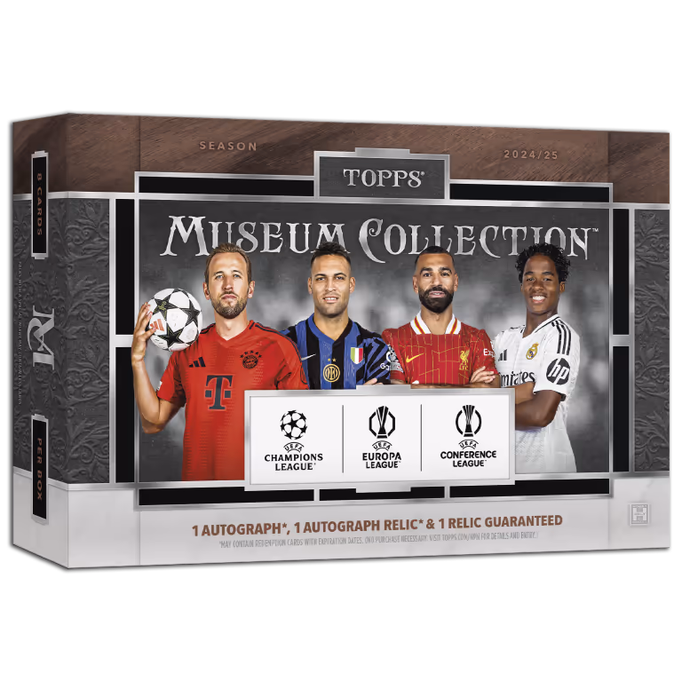 Much later than in previous years, Topps is launching the Museum Soccer Cards. In the hit-heavy 2024-25 TOPPS Museum Collection UEFA Club Competitions Soccer Cards Hobby Boxes, collectors will find 1 Autograph, 1 Autograph Relic and 1 Relic Card.