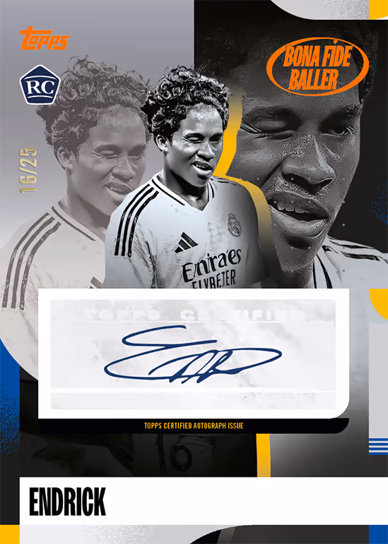 The Base Set of the Topps Real Madrid Team Set 2024/25 collection consists of 50 cards, half of which feature players from the current men’s and women’s squads, while the other half is divided into three smaller sub-sets. Flamenco Flare celebrates the best entertainers on the pitch. Bookends pays tribute to the Premierentore of major Real legends, and the Bona Fide Baller Cards highlight the club’s emerging and former stars.