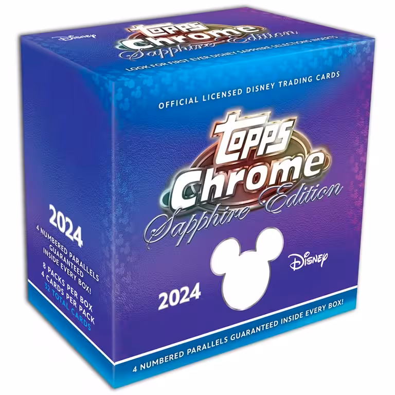 Topps erweitert die diesjährige Disney Chrome Kollektion um eine Sapphire Edition mit den typisch bläulich leuchtenden Cards im Edelstein Look. Fans der Disney Figuren können sich in der 2024 TOPPS Chrome Sapphire Edition Disney Trading Cards Kollektion auf die Sapphire Selection Inserts und Boxen mit vier nummerierten Parallels freuen.