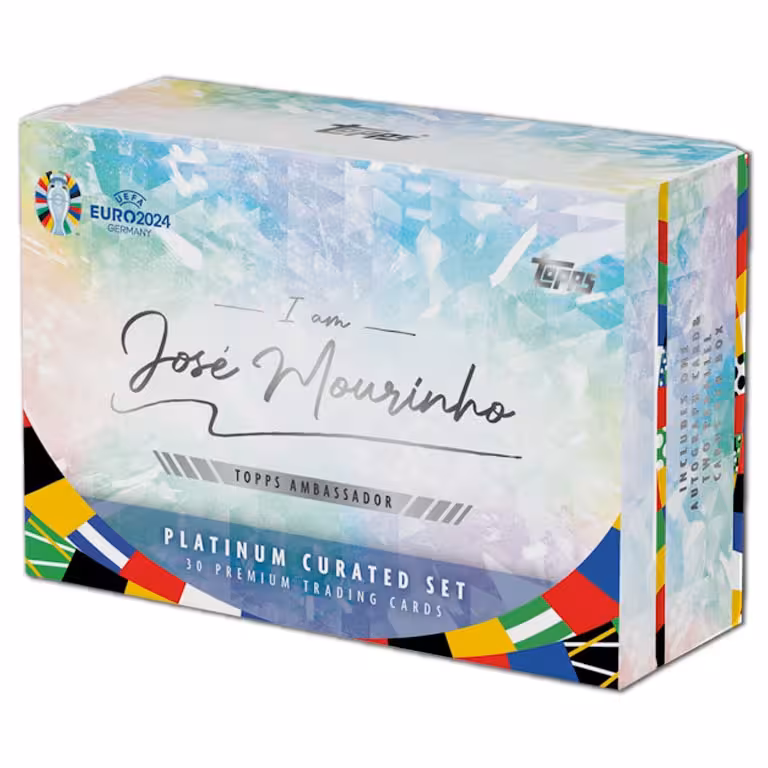 Zum zweiten Mal hat José Mourinho in Zusammenarbeit mit Topps ein Platinum Curated Set entworfen. Thematisch dreht sich im 2024 TOPPS Platinum UEFA Euro I am Jose Mourinho Curated Set diesmal alles um die bevorstehende Fußball Europameisterschaft in Deutschland. Sammler können sich auf 2 nummerierte Parallels und 1 Autograph Card pro Box freuen.