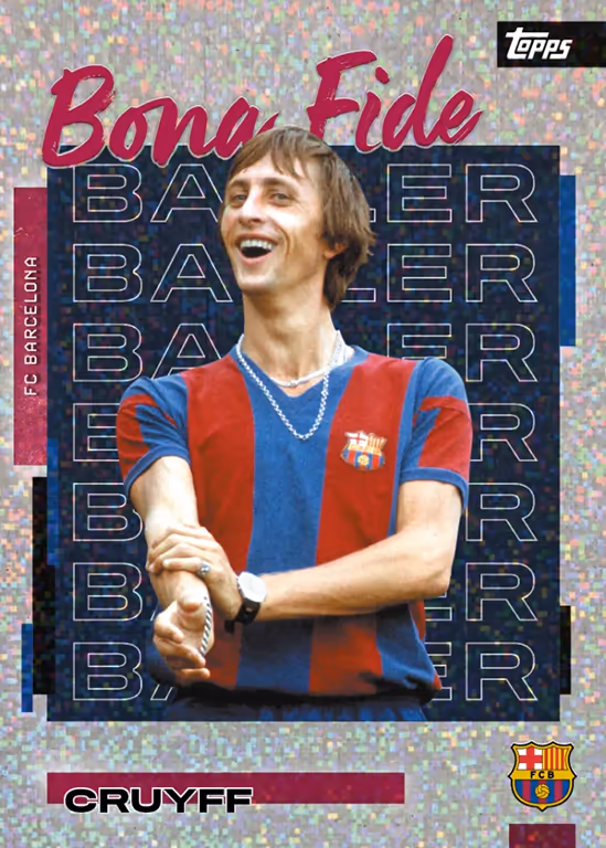 The base set of the 2025-26 TOPPS FC Barcelona Team Set Soccer Cards collection includes 50 cards and is divided into four subsets: the two categories First Team – featuring players from the current men’s and women’s squads – and Bona Fide Baller are already familiar to collectors from last season. New additions are the Pitch Pursuits and the Collector’s Corner cards with full-bleed photographic designs.