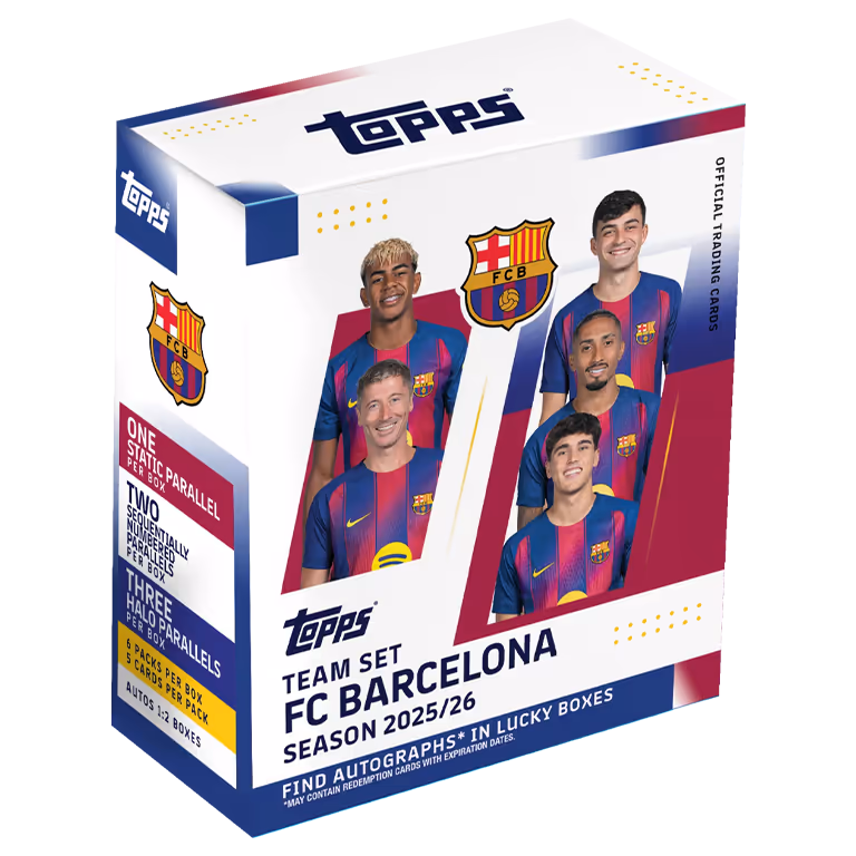 The set for the reigning Spanish champions is the next release in Topps’ Team Set line. In the boxes of the 2025-26 TOPPS FC Barcelona Team Set Soccer Cards, collectors will find 2 numbered parallel cards and, with some luck, also an autograph card from a current star or a club legend.