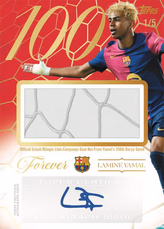 Barcelona’s current wonderkid Lamine Yamal is honored with the Century Club: Yamal Edition Autograph Relic category. In his 100th appearance for FC Barcelona – the UEFA Champions League semifinal against Inter Milan – he stole the show and made the grand European stage his own. Topps has incorporated the goal net from that match into an exclusive card signed by Yamal, which undoubtedly represents a very special collectible for any of his fans.