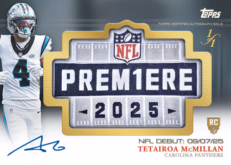 The patches embedded in ROOKIE PREM1ERE PATCH AUTOGRAPHS cards were worn by the players when they took the field for the first time in an official NFL regular season game, making these cards truly special one-of-a-kind pieces from every NFL professional’s career.