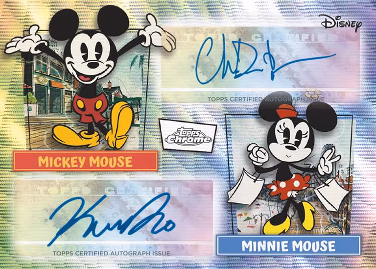 Signatures from multiple stars can be found on the MICKEY SHORTS DUAL AUTOGRAPHS and the TRIPLE AUTOGRAPH BOOKLETS, which exist only as a SuperFractor variant.