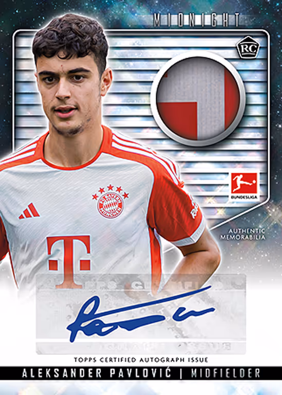 Geprägt von durch den Nachthimmel inspirierten Designs können sich die Bundesliga-Fans in der 2023-24 Topps Midnight Bundesliga Soccer Cards Kollektion auf spektakuläre Inserts, Autograph- und Autograph Relic Cards ihrer Stars freuen.