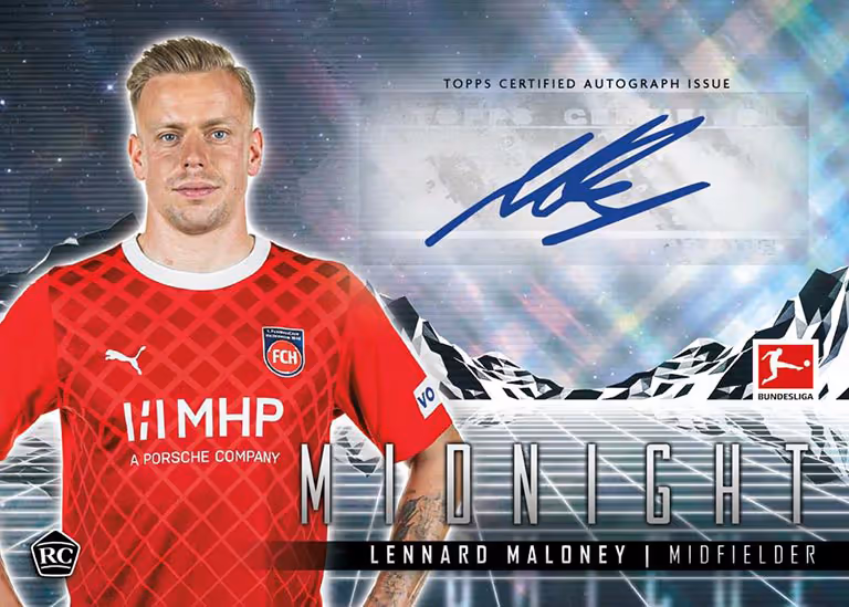 Mit der Midnight Reihe bringt Topps eine bereits bei der UFC eingeführte Marke erstmals auch in den Soccer Bereich. Die 2023-24 TOPPS Midnight Bundesliga Soccer Cards bringen pro Box zwar nur 7 Cards mit, 3 davon sind allerdings Autograph Cards von den Stars aus Deutschlands höchster Spielklasse.