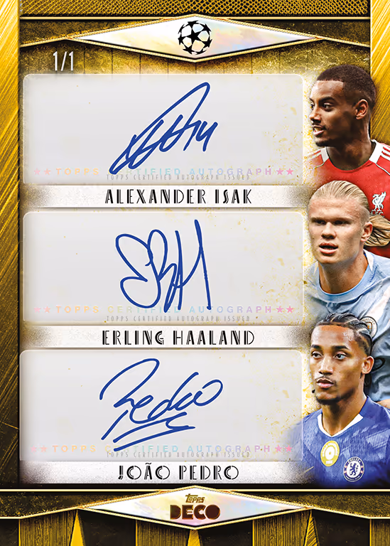 Von über 170 verschiedenen Spieler/innen können Autograph Cards aus den Topps UEFA Club Competitions Deco 2025/26 Boxen gezogen werden. Neben der einfachen Variante warten auch Dual- und Triple Autograph Cards auf die Sammler.