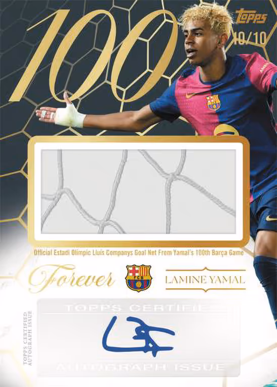 Barcelonas aktuellem Wunderkind Lamine Yamal ist die Century Club: Yamal Edition Autograph Relic Kategorie gewidmet. In seinem 100. Spiel für den FC Barcelona – dem Halbfinale der UEFA Champions League gegen Inter Mailand – stahl er allen die Show und machte die große europäische Bühne zu seiner eigenen. Das Tornetz aus diesem Spiel hat Topps in eine exklusive von Yamal unterschiebene Card eingearbeitet, die zweifellos ein ganz besonderes Sammlerstück für jeden seiner Fans darstellt.