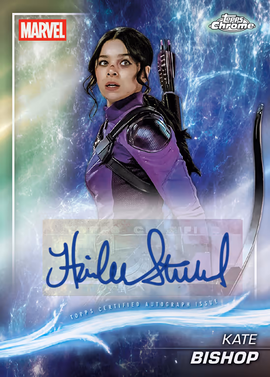 Auch Autograph Cards warten in der 2025 Topps Marvel Studios Chrome Kollektion auf die Sammler, die sich auf diesem Weg die Unterschriften von prominenten Hollywood-Stars sichern können. Erste Vorschaubilder der Cards zeigen, dass Hailee Steinfeld als Darstellerin von Kate Bishop aus der Serie Hawkeye und Oscar Isaac als Darsteller von Moon Knight unter den Autograph Cards zu finden sind.