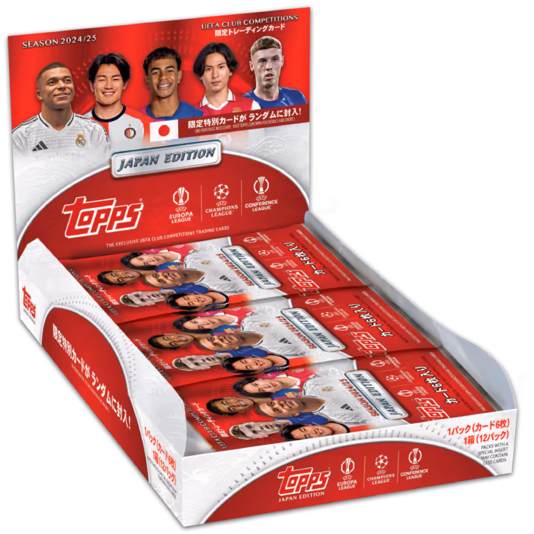 El Base Set de las 2024-25 TOPPS Japan Edition UEFA Club Competitions Soccer Cards es idéntico en contenido a la colección principal Flagship e incluye los mismos 300 jugadores de las tres competiciones: UEFA Champions League, UEFA Europa League y UEFA Conference League. En años anteriores, las cartas de la Japan Edition se reconocían principalmente por los caracteres japoneses en el reverso. Para la edición 2024/25, Topps ha incorporado una llamativa bandera japonesa en el anverso, dejando clara su pertenencia a esta edición.