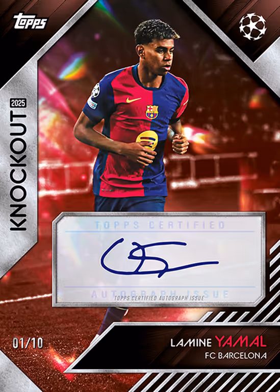 Las 2024-25 Topps Knockout UEFA Club Competitions Soccer Cards presentan por primera vez no solo a las estrellas de los equipos que siguen en competición en la UEFA Champions League, sino también a las de las competiciones europeas de clubes de categorías inferiores. Los coleccionistas pueden esperar dos cartas numeradas por caja y una Autograph Card en promedio en cada segunda caja.