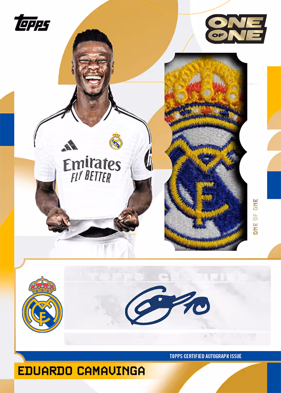 El club más laureado de España celebra su debut en la serie Team Set de Topps. Para los aficionados de los Blancos, las cajas de la colección 2024-25 TOPPS Real Madrid C.F. Official Team Set Soccer Cards incluyen Autograph, Relic o Autograph Relic Cards de estrellas actuales y leyendas del club.