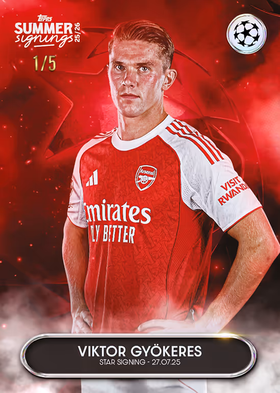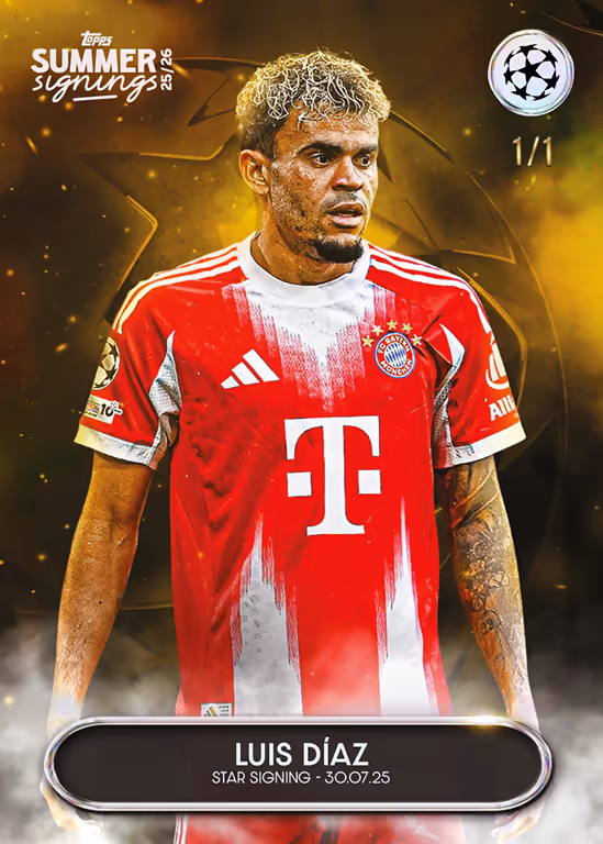 Con cartas dedicadas a los fichajes del verano, Topps inaugura los Sets On-Demand de la temporada 2025/26. Los coleccionistas pueden esperar 1 Autograph Card y 2 paralelas numeradas por caja en la colección 2025-26 TOPPS Summer Signings UEFA Club Competitions Soccer Cards.