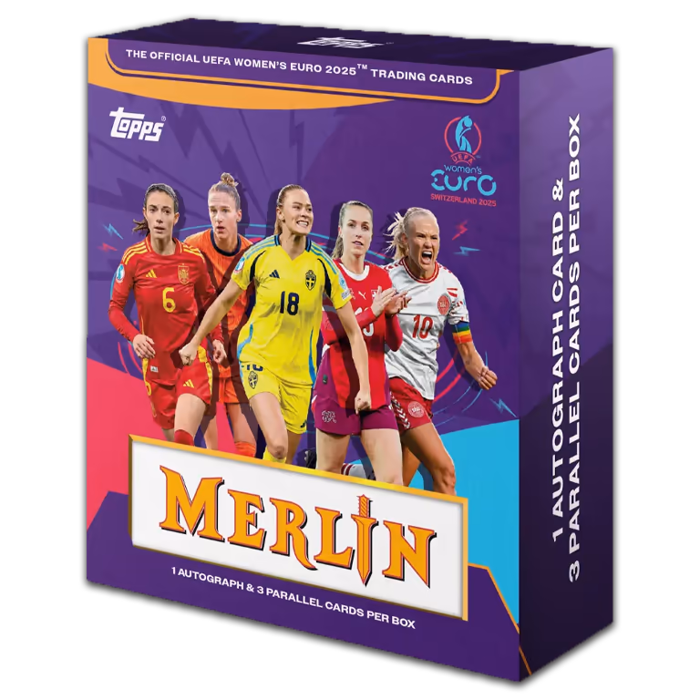Poco después del inicio de la Eurocopa femenina en Suiza, Topps lanza bajo la marca Merlin una colección oficial de Cards del torneo. En las cajas de las 2025 TOPPS Merlin UEFA Women’s Euro Soccer Cards, los coleccionistas encontrarán 1 carta autógrafo y 3 paralelas numeradas.