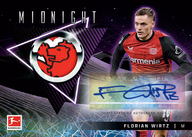 Pour la deuxième fois, Topps publie une collection Midnight Soccer consacrée à l’élite du football allemand. La collection 2024-25 TOPPS Midnight Bundesliga Soccer Cards propose à nouveau 7 cartes par boîte, dont 3 Autograph Cards.