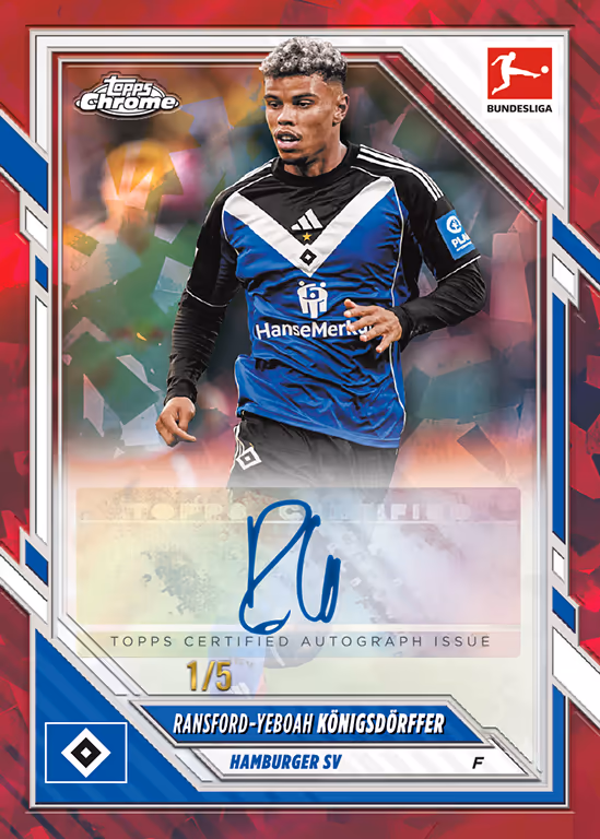 Avec la Sapphire Edition de la première division allemande, Topps propose la variante élégante et nettement plus limitée de la collection Bundesliga Chrome de la saison en cours, dont les cartes séduisent par un aspect cristallin avec une finition bleu profond.