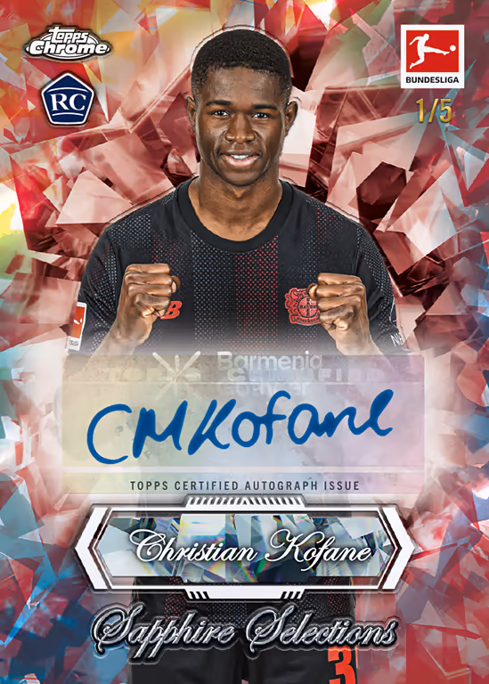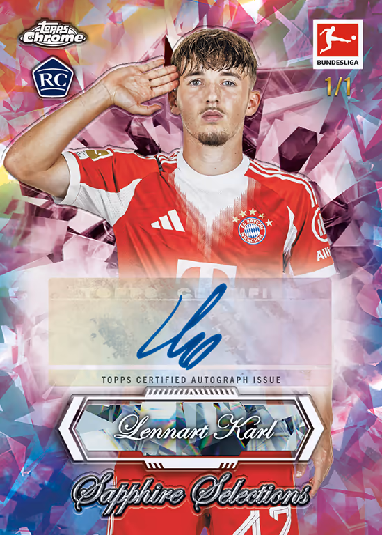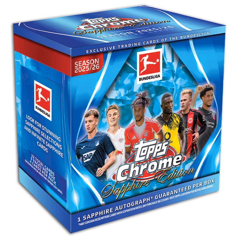 Dans la collection 2025-26 TOPPS Chrome Sapphire Edition Bundesliga Soccer Cards, les collectionneurs peuvent non seulement partir à la chasse aux cartes insert particulièrement rares et exclusives Sapphire, mais aussi se réjouir de trouver 1 carte autographiée Sapphire par boîte hobby.