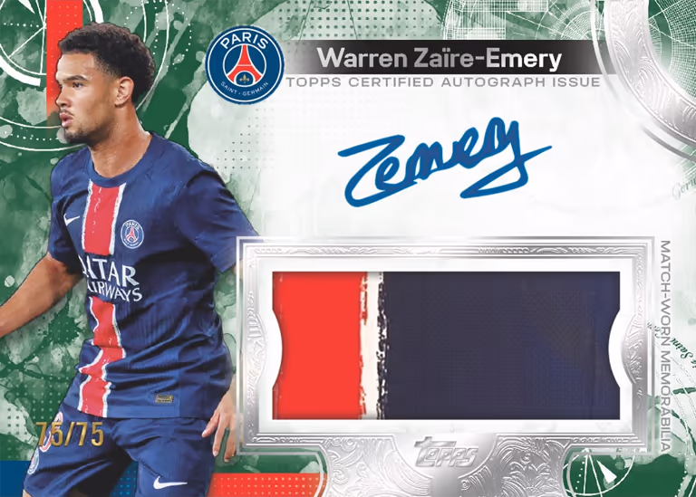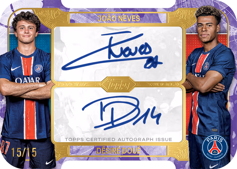 Con Exhibition, Topps lancia una nuova linea di Soccer Cards di fascia alta. Per ogni box delle 2024-25 TOPPS Exhibition Paris Saint-Germain Soccer Cards, i tifosi dei pluricampioni di Francia possono contare su 1 Autograph e 1 Autograph Relic Card.