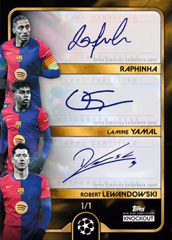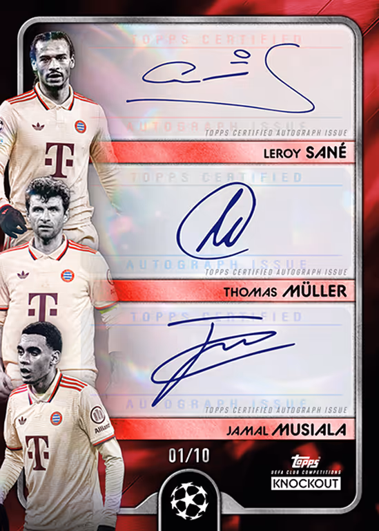 I collezionisti di Autograph Cards dovranno affidarsi un po’ alla fortuna, poiché queste carte molto ricercate compaiono solo in media in una Topps UEFA Knockout Box su due. Oltre alle Autograph Cards standard, Topps introduce per la prima volta le Triple Autograph Cards come nuovo highlight del Topps UEFA Knockout Set. Per queste carte speciali, che esistono per 7 squadre, le firme di 3 grandi stelle sono state riunite su un’unica carta.