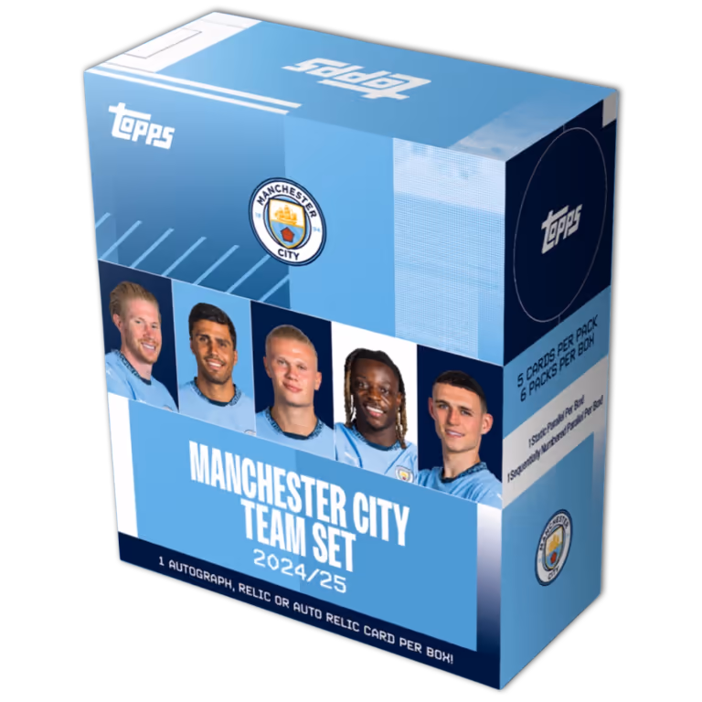 I team set rappresentano il livello di prodotto successivo ai fan set pensati per chi entra nel hobby. Offrono una probabilità più alta di ottenere Autograph Cards e includono anche Relic Cards e Autograph Relic Cards. Chi acquista una box delle 2024-25 TOPPS Manchester City Official Team Set Soccer Cards riceve garantita una Autograph, Relic o Autograph Relic Card di una stella della rosa attuale o di una delle grandi leggende dei Cityzens.