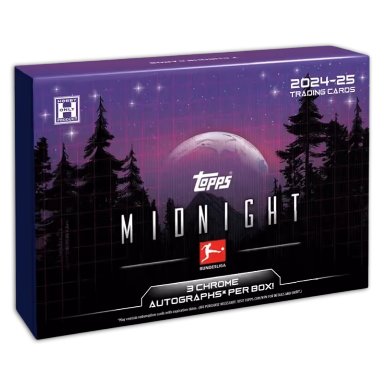 Per la seconda volta, Topps lancia una collezione Midnight Soccer dedicata alla massima serie tedesca. La collezione 2024-25 TOPPS Midnight Bundesliga Soccer Cards offre nuovamente 7 carte per box, tra cui 3 Autograph Cards.
