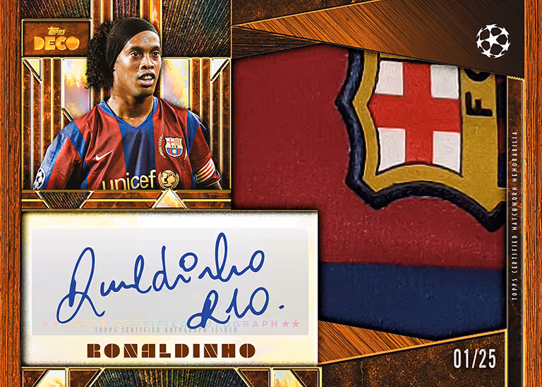 Come uno dei primi set della nuova stagione, anche quest’anno arrivano le 2025-26 TOPPS Deco UEFA Club Competitions Soccer Cards. Oltre a una Autograph Card di giocatori attuali o leggende, in ogni Deco box i collezionisti troveranno tre Parallels numerati.