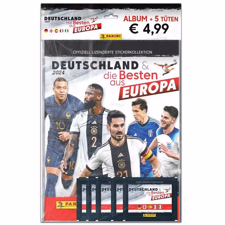 Mit der Panini Deutschland & die Besten aus Europa 2024 Sticker Kollektion präsentiert Panini nicht nur ausfühlich die aktuellen Spieler der Deutschen Nationalmannschaft auf ihrem Weg zur UEFA Euro 2024, sondern auch vier weitere Nationalteams, für die man weiterhin im Besitz der Lizenzrechte ist. Neben dem DFB-Team sind das die Nationalmannschaften von England, Frankreich, Italien und Spanien.