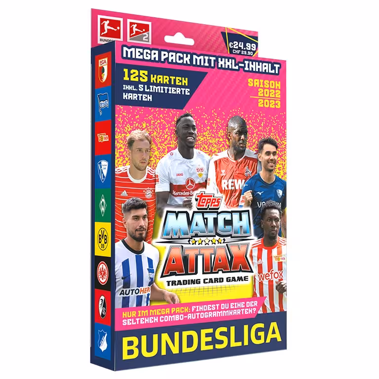 Dazu gibt es in dieser Saison erstmals Combo-Autograph Cards, mit zwei Autogrammen aktueller Bundesliga Stars auf einer Trading Card. Sechs dieser speziellen Autogramm Trading Cards hat Topps für die Bundesliga Match Attax 2022/23 Kollektion entworfen. Diese lassen sich nur exklusiv in den Mega Packs finden, einem Produkt, welches Topps zu dieser Saison neu einführt.