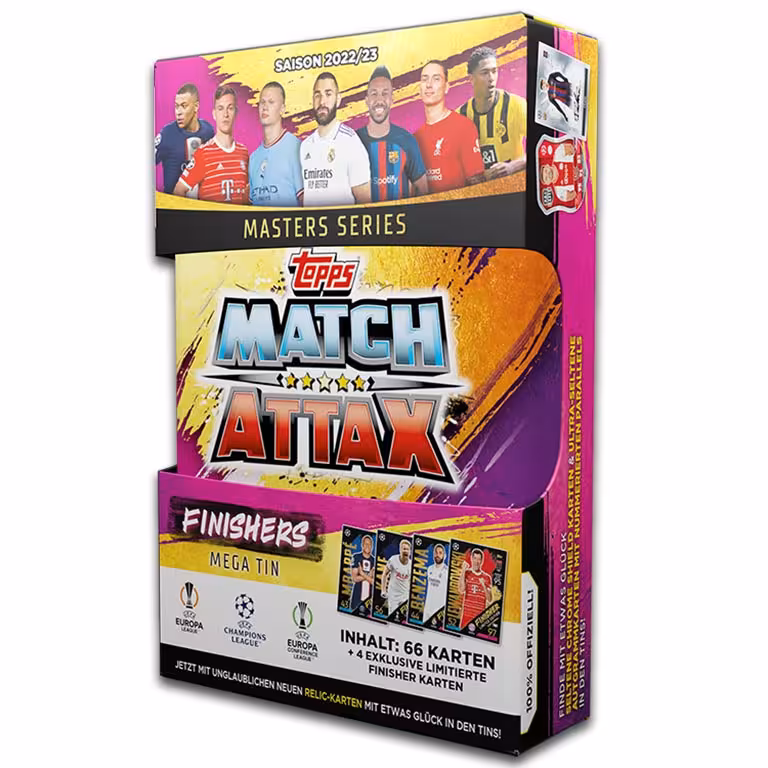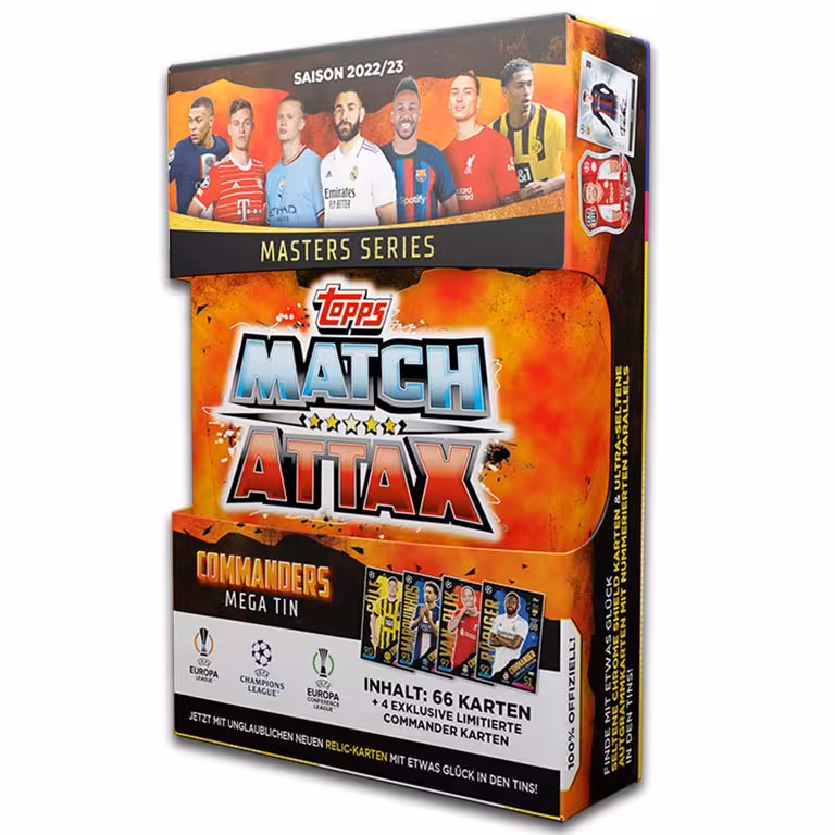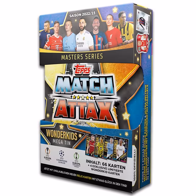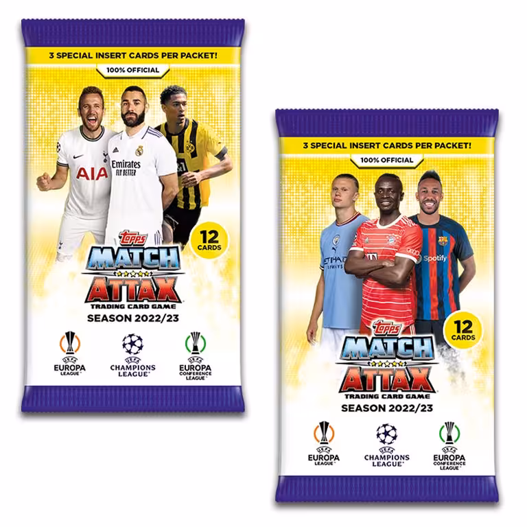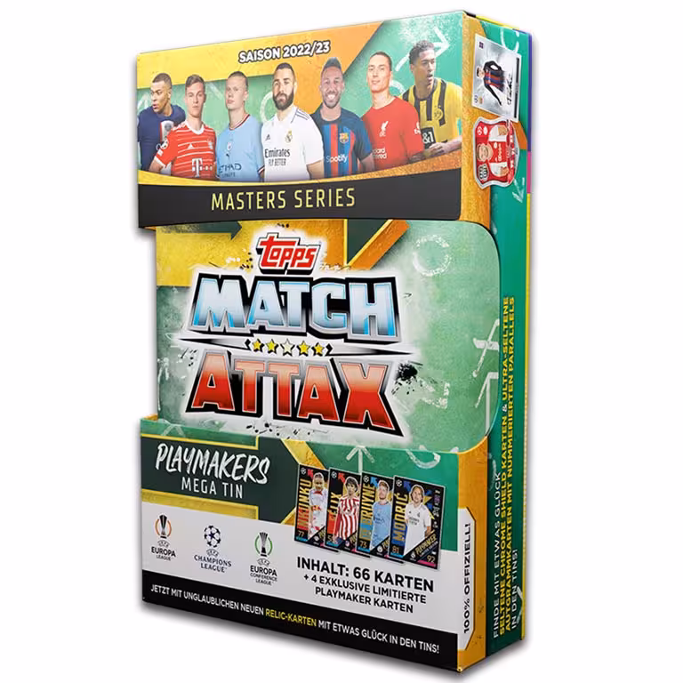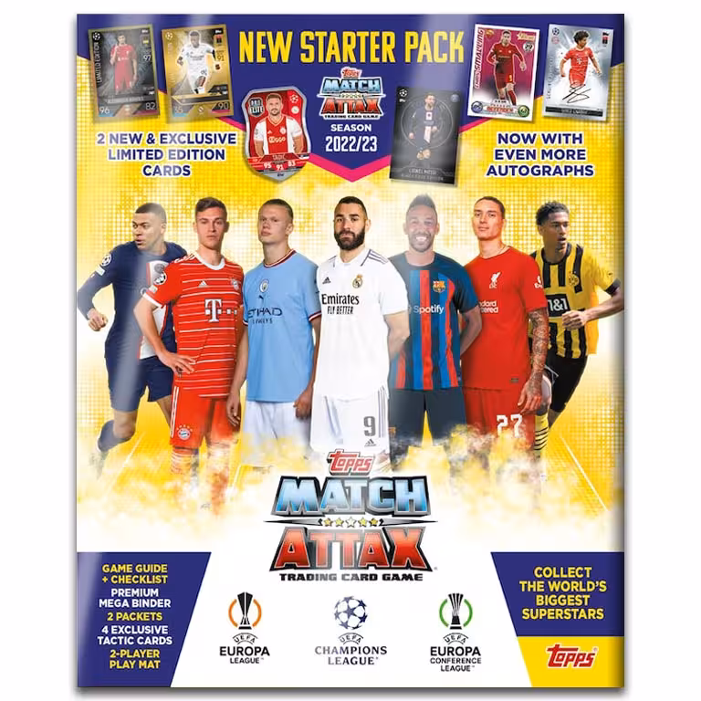 Auch wenn die neue Saison der europäischen Klubwettbewerbe erst mit den Gruppenspieltagen im September richtig Fahrt aufnimmt, trommelt Topps bereits seit Mitte Juli für seine neue Match Attax Kollektion zur Saison 2022/23, die in der zweiten Augusthälfte den Handel erreichen soll. Wie schon in im Vorjahr, handelt es sich nicht mehr um eine reine Champions League Match Attax Kollektion, sondern um ein Sammelwerk mit Teams aus allen drei großen UEFA Klubwettbewerben.