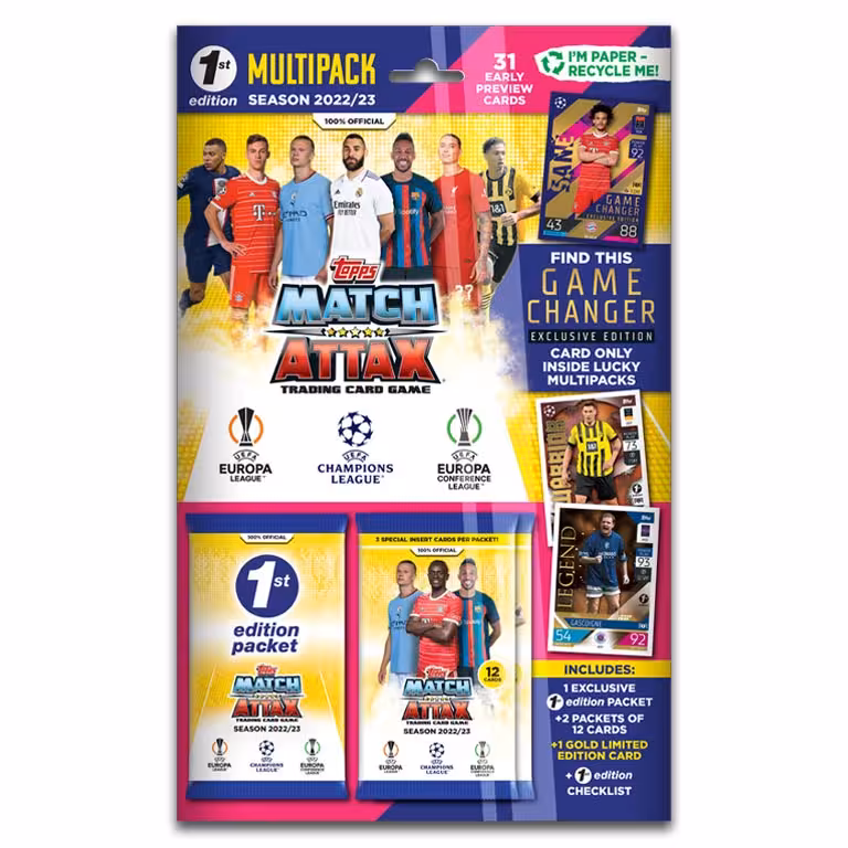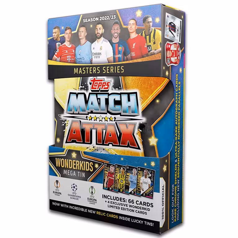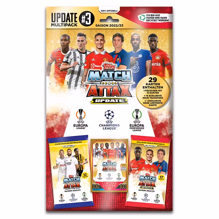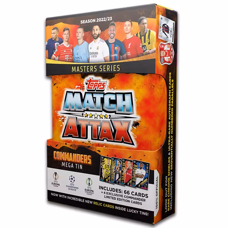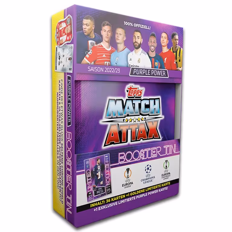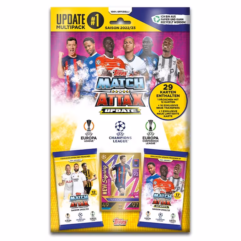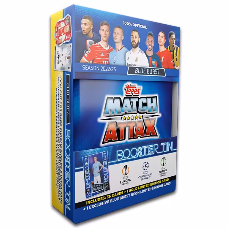 Auch wenn die neue Saison der europäischen Klubwettbewerbe erst mit den Gruppenspieltagen im September richtig Fahrt aufnimmt, trommelt Topps bereits seit Mitte Juli für seine neue Match Attax Kollektion zur Saison 2022/23, die in der zweiten Augusthälfte den Handel erreichen soll. Wie schon in im Vorjahr, handelt es sich nicht mehr um eine reine Champions League Match Attax Kollektion, sondern um ein Sammelwerk mit Teams aus allen drei großen UEFA Klubwettbewerben.