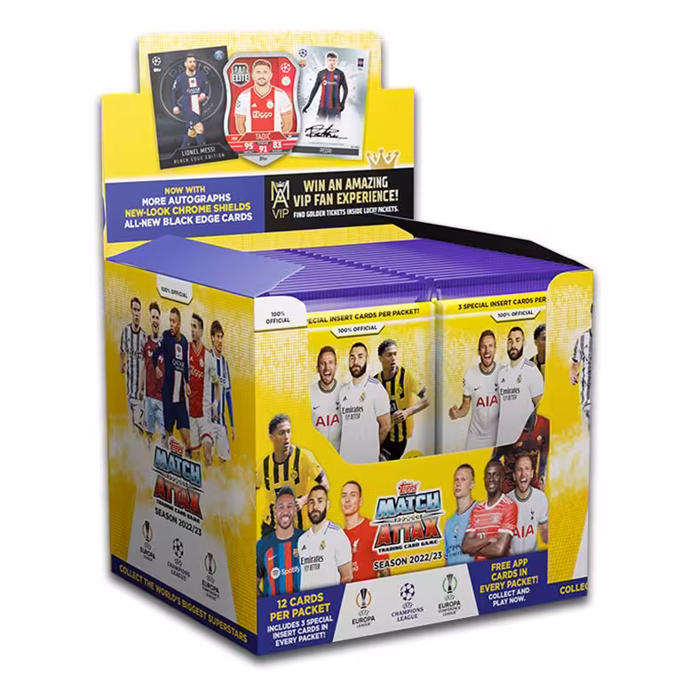 Mit den TOPPS UEFA Club Competitions Match Attax 2022/23 Cards startet knapp drei Wochen vor dem ersten Gruppenspieltag der UEFA Champions League die offizielle Trading Card Kollektion zu den europäischen Klubwettbewerben. Sammler dürfen sich auch in dieser Saison auf Autograph und Memorablia Cards zu den Top Stars des europäischen Fußballs freuen.
