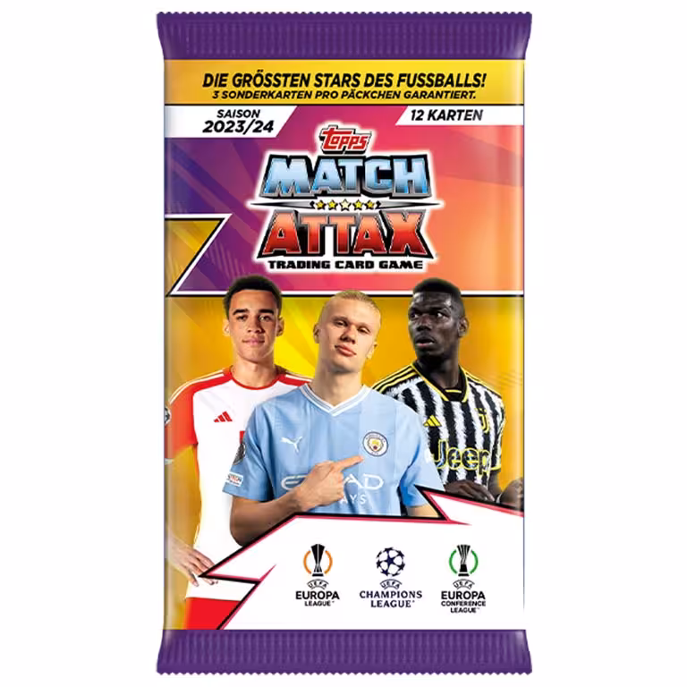 Während in den europäischen Ländern die Ligen so nach und nach ihren Spielbetrieb wieder aufnehmen, steht auch Topps mit den Match Attax Cards zur Saison 2023/24 bereits in den Startlöchern. Diese widmen sich wie im Vorjahr wieder den drei europäischen Klubwettbewerben UEFA Champions League, UEFA Europa League und UEFA Europa Conference League. Da eine Kollektion mit den 96 Teams aus allen drei Wettbewerben den Rahmen sprengen würde, pickt Topps sich die besten Teams mit den größten Stars heraus und bringt diese ab Ende August als Trading Card Game zu den Sammlern.